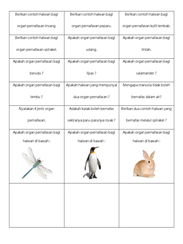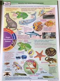 Haiwan yang tinggal di darat biasanya bernafas menggunakan peparu. Air masuk melalui mulut dan kemudian dialirkan melalui insang. Setiap murid diberikan sehelai kertas a4. Mereka bernafas melalui insang mereka dan dapat bertahan seketika daripada air. Mereka menyerap air melalui kulit, sehingga tidak perlu minum. 1) hidup di dalam air, 2) bernafas melalui insang Haiwan akuatik boleh ditemui di habitat laut dan air tawar. Haiwan vertebrata adalah kumpulan haiwan yang mempunyai tulang belakang. Haiwan membiak dengan melahirkan anak atau secara bertelur. Ada haiwan yang bernafas melalui spirakel, kulit lembap dan insang. Terdapat dua jenis habitat bagi ikan iaitu air tawar dan air masin. Sementara itu, bernafas melalui liang kulit diperhatikan dalam haiwan sebagai amfibia dan annelids, yang mempunyai pernafasan kulit. Pengelasan haiwan bertulang belakang ataupun lebih dikenali sebagai vertebrata, dikelaskan kepada 5 kumpulan yang berbeza mengikut beberapa ciri iaitu kelas ikan, amfibia, reptilia, burung dan mamalia.