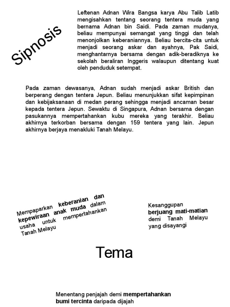 Berdasarkan novel yang saya pelajari iaitu novel leftenan adnan wira bangsa karya abdul latip bin talib, tema novel ini ialah semangat kepahlawanan askar melayu dalam mempertahankan tanah air daripada dijajah oleh orang asing. This study entitled analysis of the novel leftenan adnan wira bangsa work abdul latip bin talib with the objective to study the thinking of the author in his work which is related to the events he undertook as well as though the experiences of other individual that are adapted in this novel. Novel leftnan adnan wira bangsa : Salah satu latar tempat yang terdapat dalam novel ini ialah warung pak samad. Adnan berani mengejar(chase) lembaga(a group of people) yang menceroboh(trespass) masuk ke kawasan rumahnya pada waktu malam walaupun(even though).