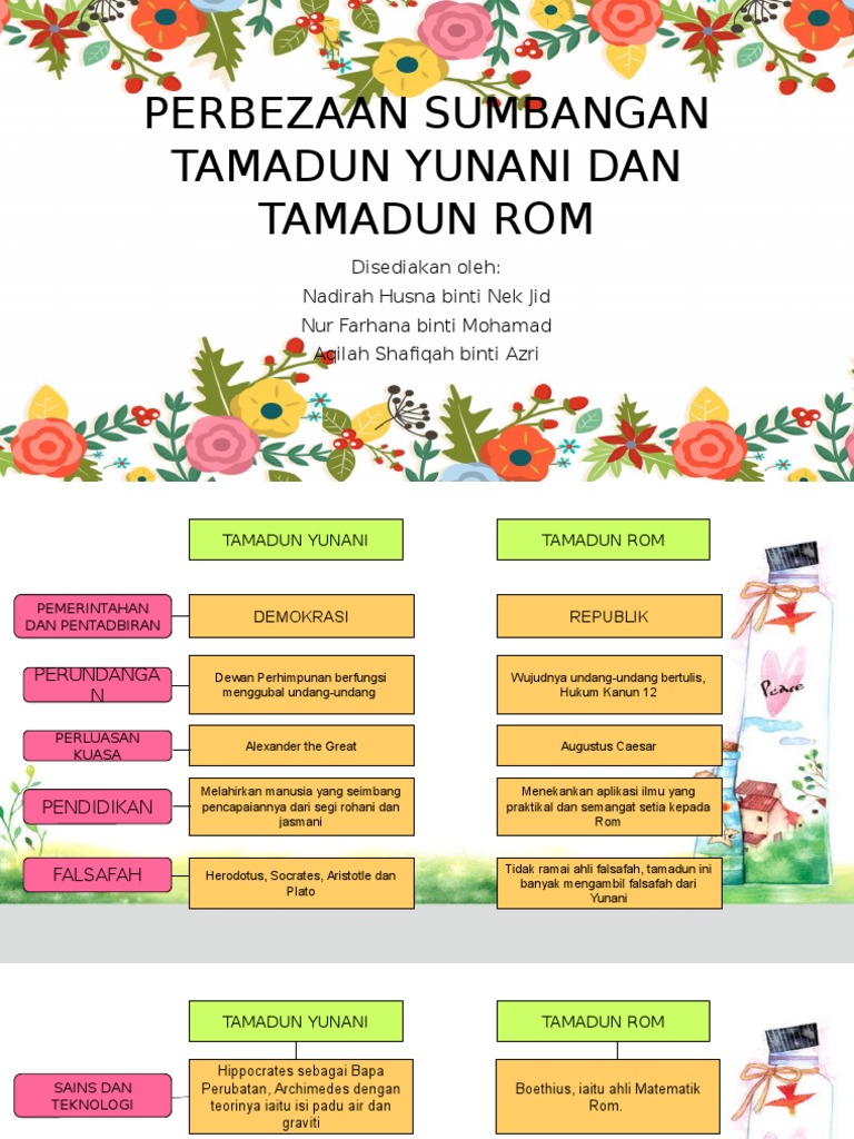 Peningkatan pesat telah berlaku dalam pelbagai bidang dalam tamadun yunani dan tamadun rom. Tokoh peluasan kuasa tamadun yunani dan rom yunani : Pada peringkat awal perkembangan pendidikan dan ilmu pengetahuan, rom banyak mengambil dan menyerap unsur dari yunani. Tamadun rom tamadun rom 1. Secara mutlak ketrunan etruscan bukan latin tempatan.