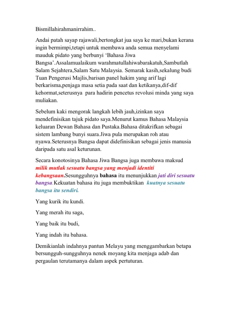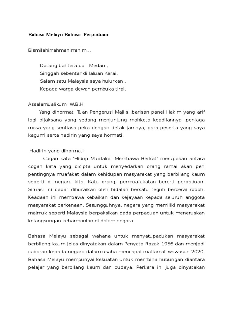 Bahasa melayu bahasa perpaduan bismilahirrahmanirrahim… datang bahtera dari medan. Bapa/rakamas/adhimas* … (nama paraga pasrah) ingkang satuhu lebda ing karya miwah satuhu pantes ingurmatan. Secara umum, pidato adalah pengungkapan gagasan atau pikiran dengan bahasa lisan (berbicara) kepada orang banyak. .bahwa pembukaan pidato merupakan hal penting, entah itu pidato dalam bahasa indonesia, bahasa jepang, atau pun bahasa inggris. Skrip pidato memartabatkan bahasa melayu.