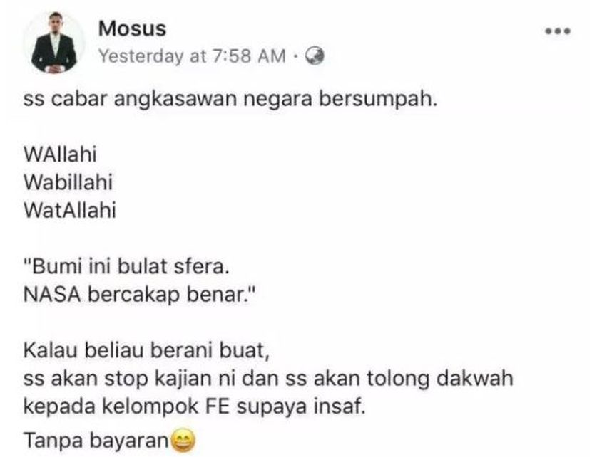 Pengakuan sumpah itu bagi menjawab ribuan mesej di laman sosial bertanyakan bentuk muka bumi.
